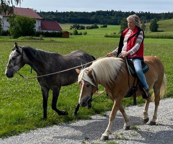 Im August 24 sind wir “nur mal zum guggen”, nach Hessen gefahren auf das Gestüt Reckerode. Bettina Schürer hat dort eine leidenschaftliche Berberzucht geführt, die sie aus Gesundheitsgründen aufgeben musste. Ich habe in ihr eine Pferdefrau vom “alten Schlag” getroffen, soviel Lebenserfahrung mit Arbeitsreitweisen und Pferden und so viel Paralellen miteinander. (Ich konnte sie für Anfang Mai 26 für einen Reitkurs gewinnen). Dann haben wir uns drei Monate das Hirn zermartert und die zwei Vierjährigen Berber gekauft. Meine Freundin Bettina hat sich für Lounis entschieden, mir lachte Lyas ins Herz. Unvernünftig? Klar, aber wie eine Freundin meinte: du willst doch noch kein Leben „auf Reserve“ leben…